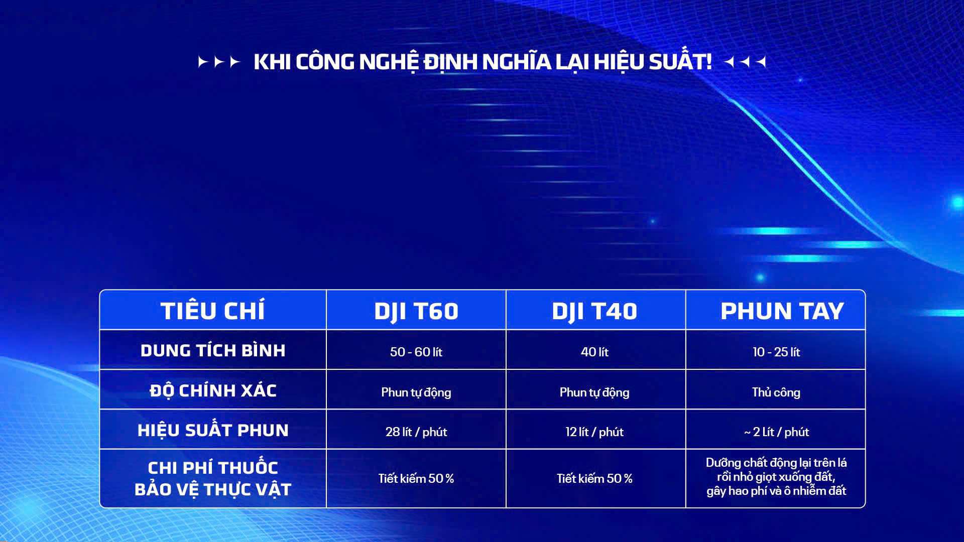 Nếu bà con cần một dòng máy có khả năng làm việc liên tục trong nhiều giờ, DJI T50 là lựa chọn hàng đầu. Máy có hiệu suất mạnh mẽ, ít phải sạc pin, ít phải tiếp nhiên liệu, tiết kiệm thời gian tối đa.