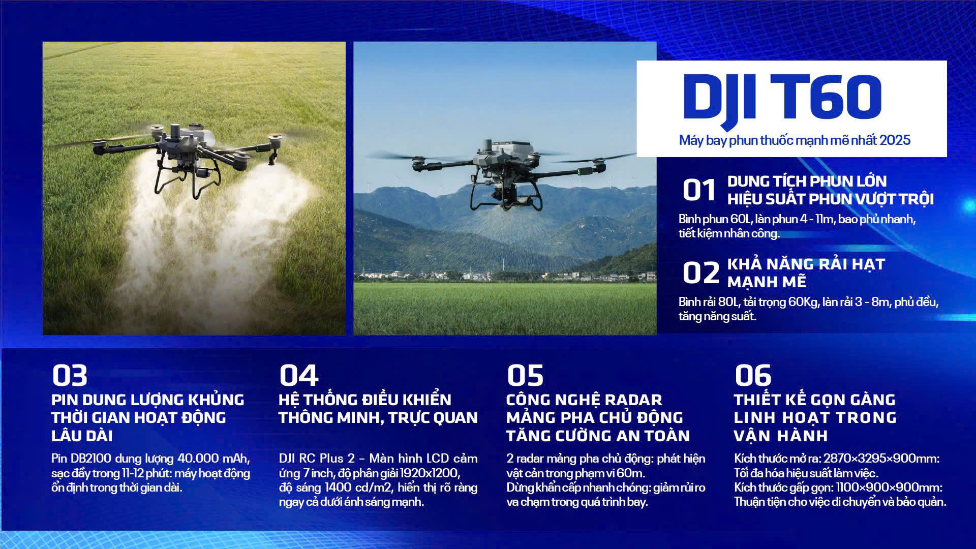 Ngày nay, máy bay phun thuốc DJI không chỉ là thiết bị hỗ trợ phun thuốc bảo vệ thực vật, mà còn giúp bà con gieo hạt, bón phân, chăm sóc cây trồng một cách tự động. Đây là giải pháp hiện đại, hiệu quả cao, giúp bà con tiết kiệm chi phí thuê nhân công, đảm bảo năng suất và nâng cao chất lượng nông sản.